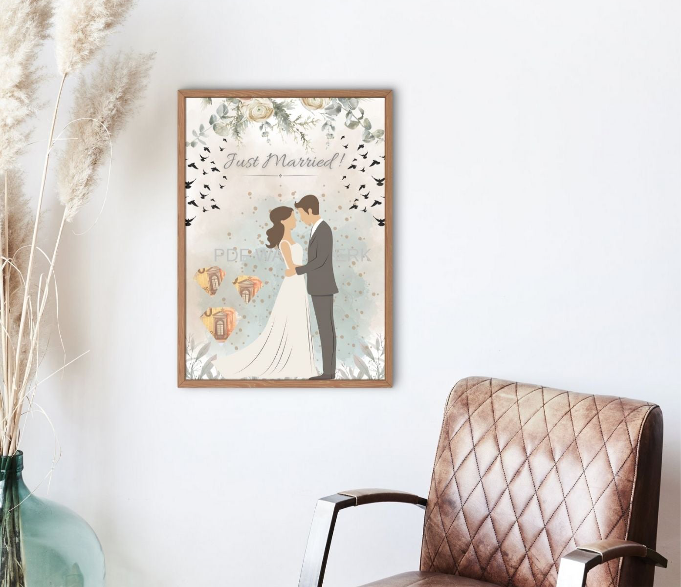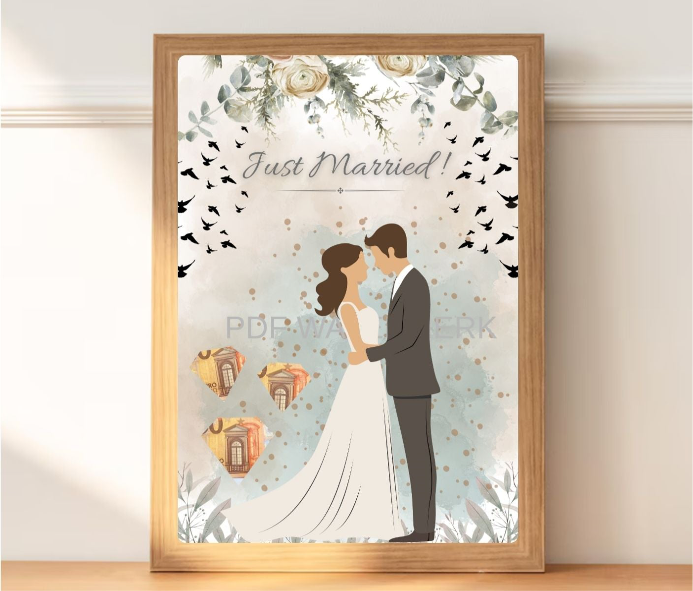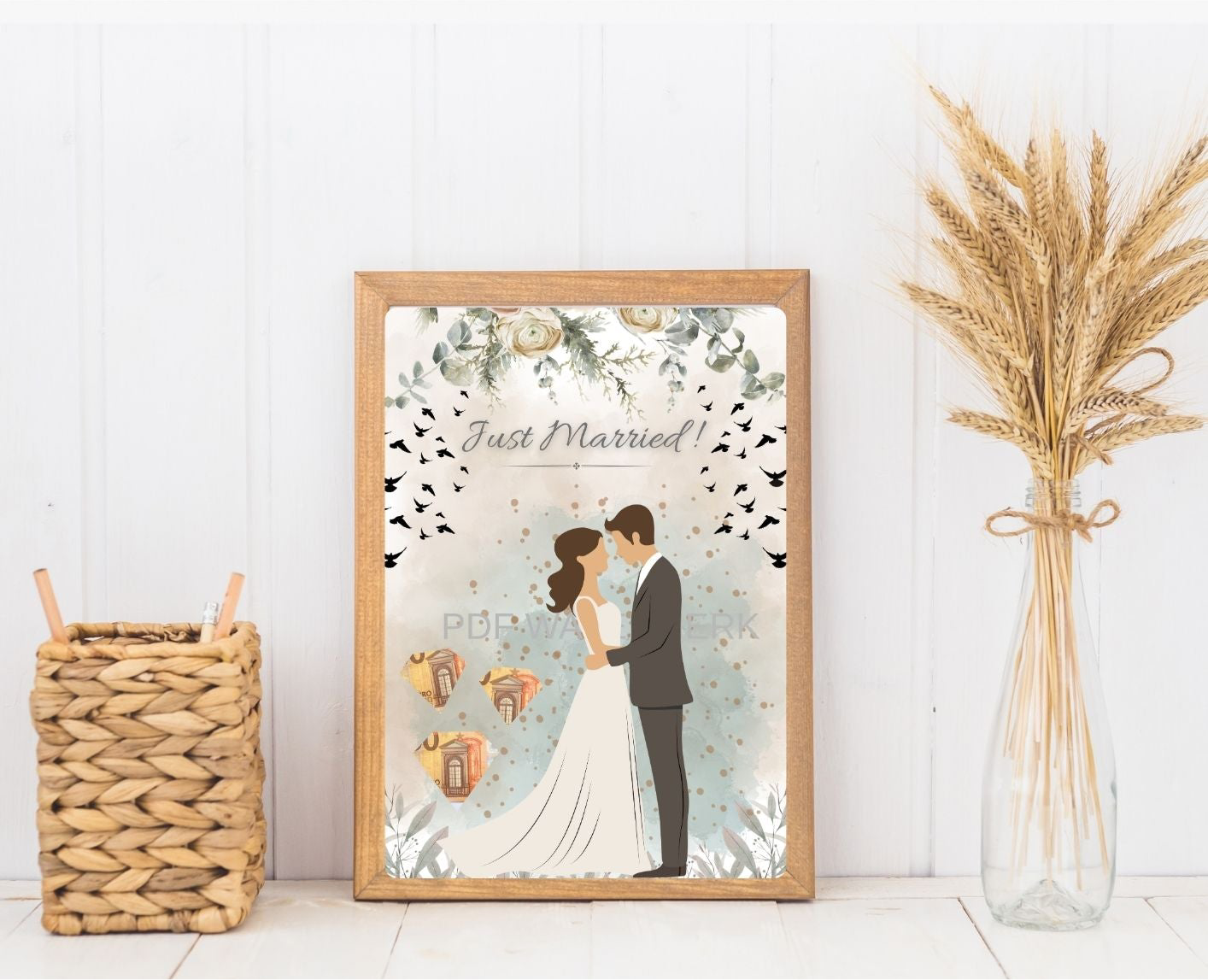 Geef geld cadeau op de bruiloft met ons " Just married " fotolijst geldcadeau! Dit passende ontwerp compleet met een bruidspaar, vogels en bloemen, is perfect voor het feliciteren van pasgetrouwde stellen. Een uniek geldcadeau aan het bruidspaar dat op elk thema bruiloft gegeven kan worden voor zowel dag als avond gast.